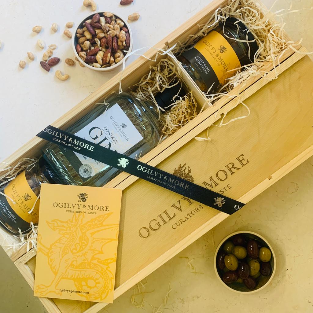 This lovely gift is complimented by two of our most popular nibbles; a jar each of our Garlic & Chilli Olives and our Luxury Truffle Salted Roasted Nuts.