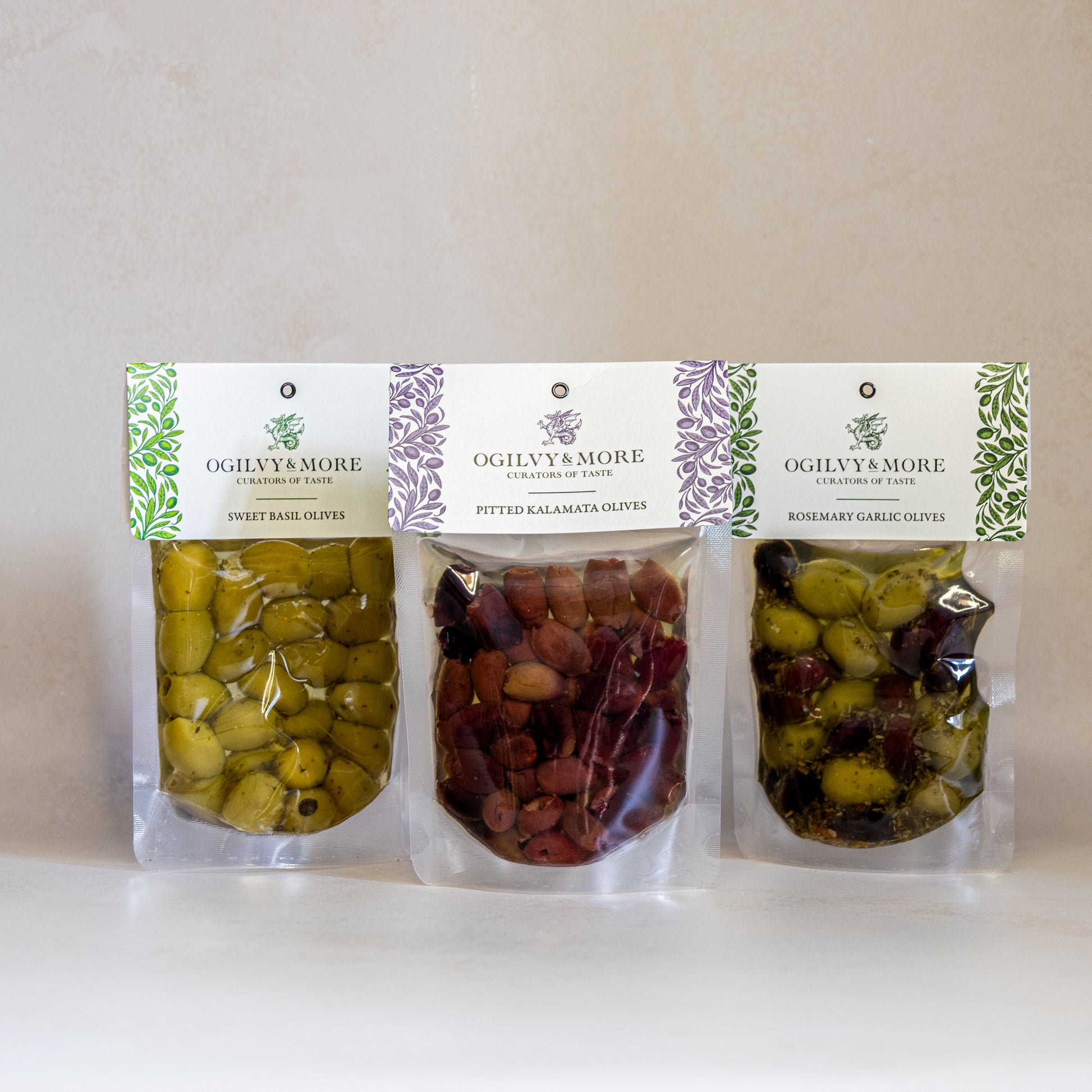 This pack contains three of our top sellers: Rosemary & Garlic Olives, Sweet Basil Olives and Pitted Kalamata Olives.
