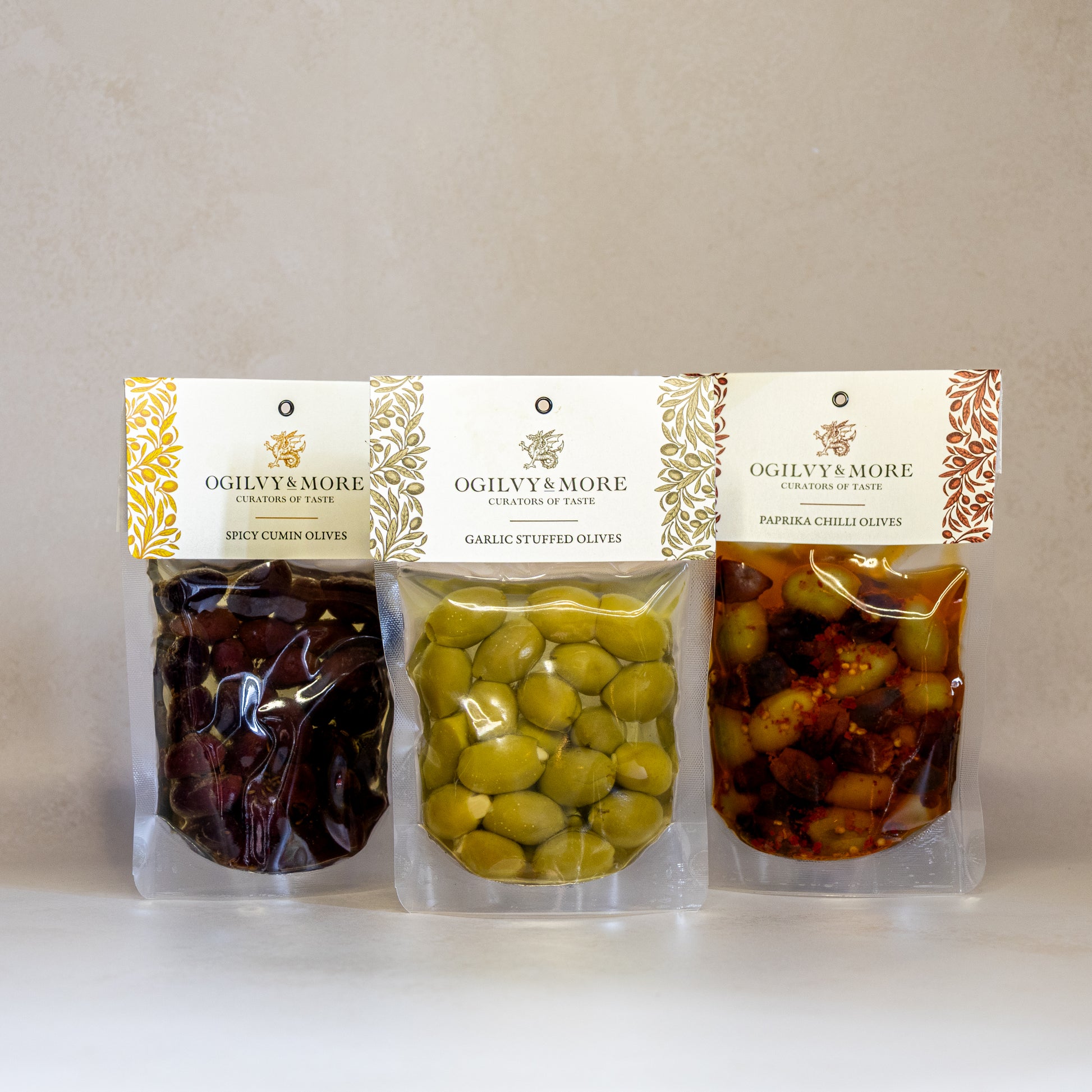 This pack contains three of our top sellers: Spicy Cumin Olives, Paprika Chilli Olives and Garlic Stuffed Olives.