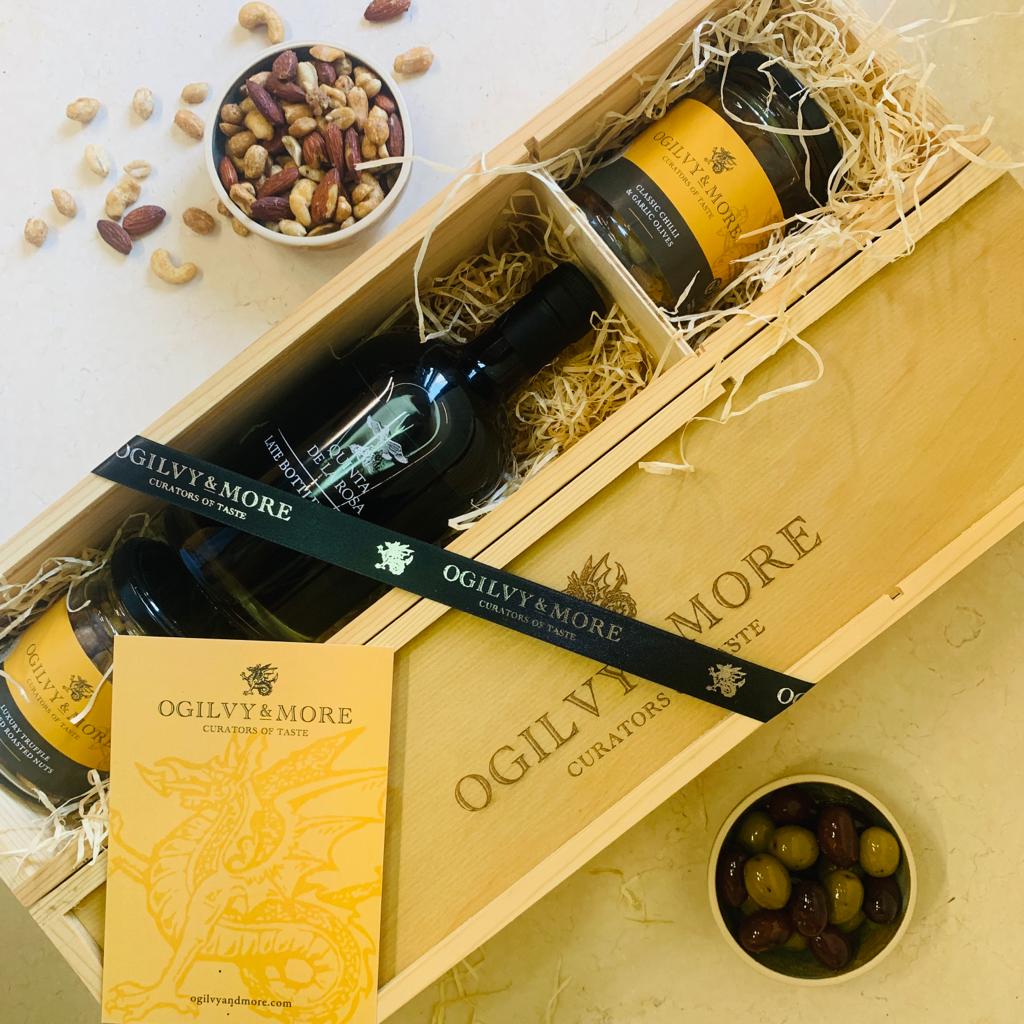 This lovely gift is complimented by two of our most popular nibbles; a jar each of our Garlic & Chilli Olives and our Luxury Truffle Salted Roasted Nuts.